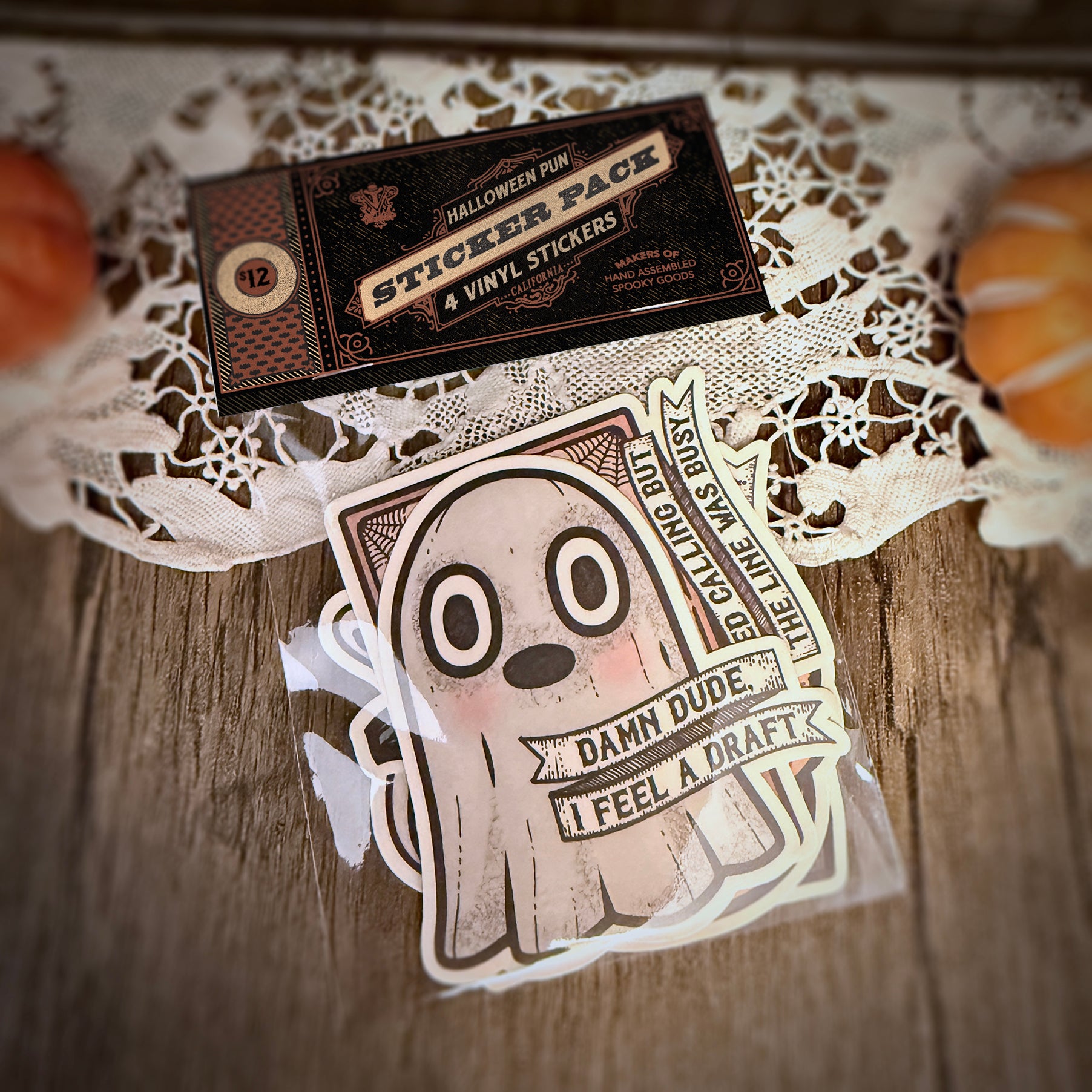 Part of the ongoing Haunted Abode Collection, a sticker pack with fun Halloween puns.