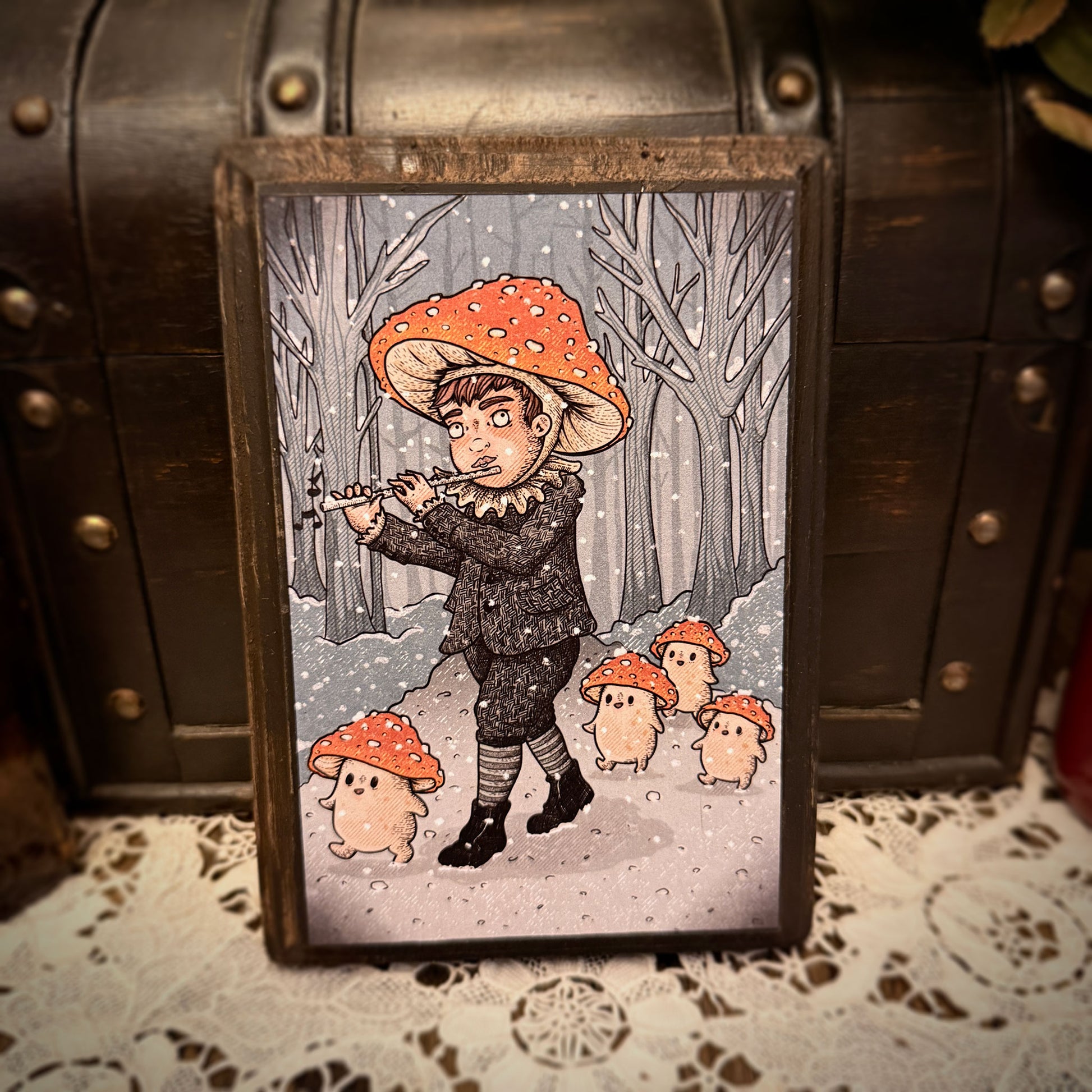 This print features one of my haunted Orphans, inspired by a Pied Piper twist leading a band of whimsical amanita mushroom spirits through a shadowy, fairy-tale world. It’s perfect for fans of dark art, folklore-inspired illustrations, and spooky mushroom décor. A striking piece for any witchy wall, forest-fantasy collection, or Halloween-loving home.