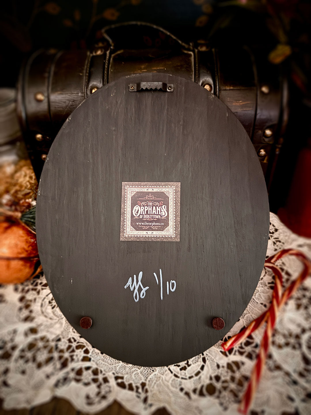 When the Orphans unwrapped their mysterious Christmas gift, a tiny Krampus leapt out, captured in this limited edition holiday print sealed beneath a glossy resin dome. This piece blends dark folklore, spooky Christmas charm, and eerie storybook vibes, making it perfect for collectors of horror-inspired artwork, gothic holiday décor, and limited edition dark art prints.
