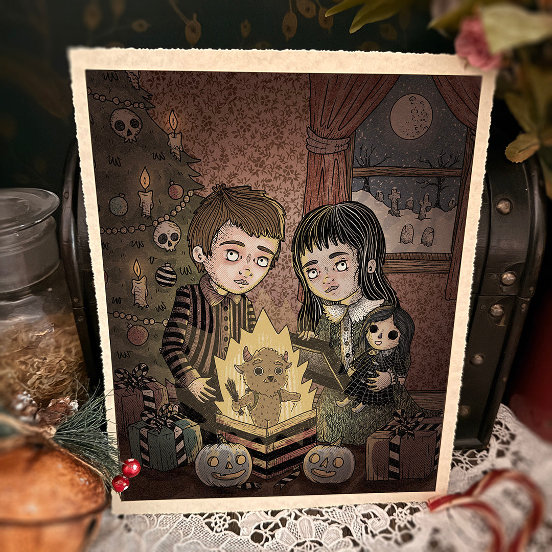 When the Orphans unwrapped their mysterious Christmas gift, a tiny Krampus leapt out. This piece blends dark folklore, spooky Christmas charm, and eerie storybook vibes, making it perfect for collectors of horror-inspired artwork, gothic holiday décor, and limited edition dark art prints.